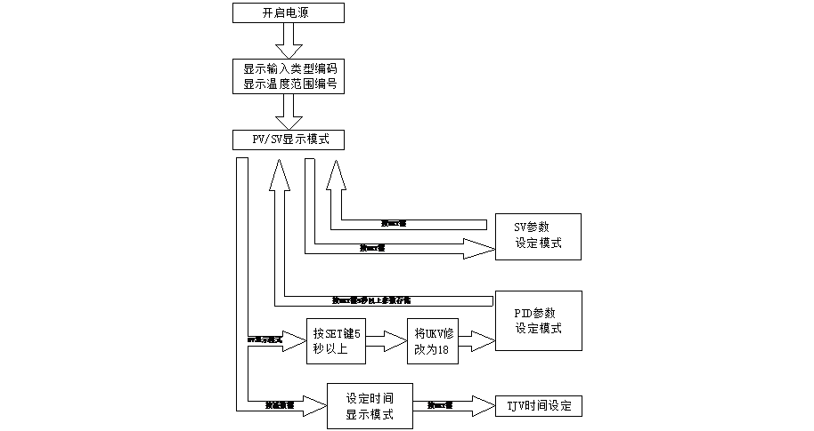 4、 依次按“SET”,PID參數設定模式將會依次出現:Pv,Iv,Dv,ITv,ALv,Tv,Btv,PKv,Ukv。