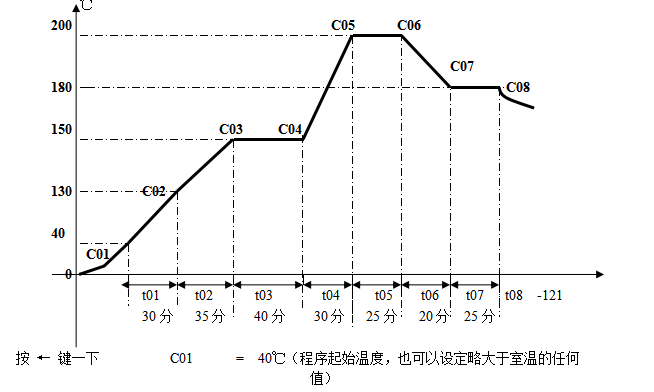 接通電源,按↑鍵二秒鐘使SV窗口出現STOP(暫停)。設定步驟:按一下←鍵,上排PV顯示C01,表示需要程控的起始溫度,操作←↑↓鍵,使下排SV達到所需起始溫度。再按下SET鍵,PV顯示t01,表示從起始溫度達到下一設定溫度的時間,操作←↑↓鍵,使SV達到所需時間。再按下SET鍵,PV顯示C02,表示剛才設定的起始溫度C01,用了t01的時間,所要達到的溫度,按←↑↓使SV達到所需溫度。(如需恒溫,則C01與C02設置同一值),再按下SET鍵,PV顯示t02表示從C02到達下一溫度的時間設定,按前面步驟操作…,**后一段T參數設置 “-121”即可自動關機,**多達30段,**后結束段將txx設置-121設置完畢等SV返回STOP再按↓鍵使顯示窗口出現RUN儀器自動按照設定的程序開始工作。程序編排采用溫度--時間-溫度格式,其定義是從當前段設置溫度,經過該段設置的時間到達一溫度。 例示:按下圖所示程序曲線設定各段程序值(從40度用30分鐘升到130度再用35分鐘升到150度恒溫40分鐘再用30分鐘升到200度恒溫25分鐘再用20分鐘降到180度再恒溫25分鐘后自然冷卻)