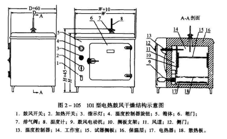 101型鼓風(fēng)干燥箱內(nèi)裝有鼓風(fēng)機(jī),工作室內(nèi)空氣借鼓風(fēng)機(jī)促成機(jī)械對(duì)流。開(kāi)啟排氣閥門可使工作室內(nèi)之空氣得以更換,獲得干燥效果,溫度用儀表進(jìn)行自動(dòng)控溫,控溫儀、繼電器及全部電氣控制設(shè)備均裝于箱側(cè)控制層內(nèi),控制層有側(cè)門可以卸下,以備檢察或修理線路時(shí)用。