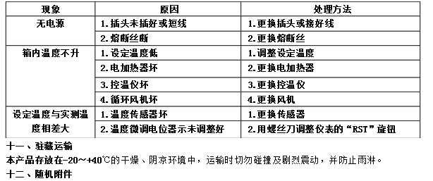 4.通風良好,落塵量小,空氣濕度不大于85% 5.經常保持箱內外清潔、干燥 6.干燥箱上面不得堆放物品。 十、故障處理